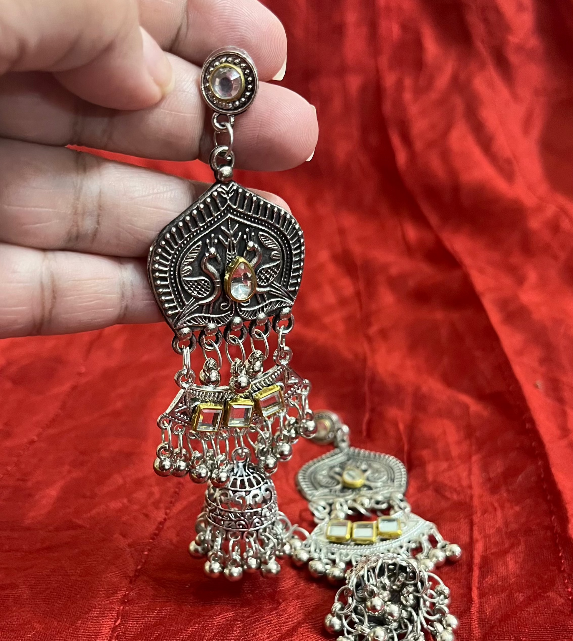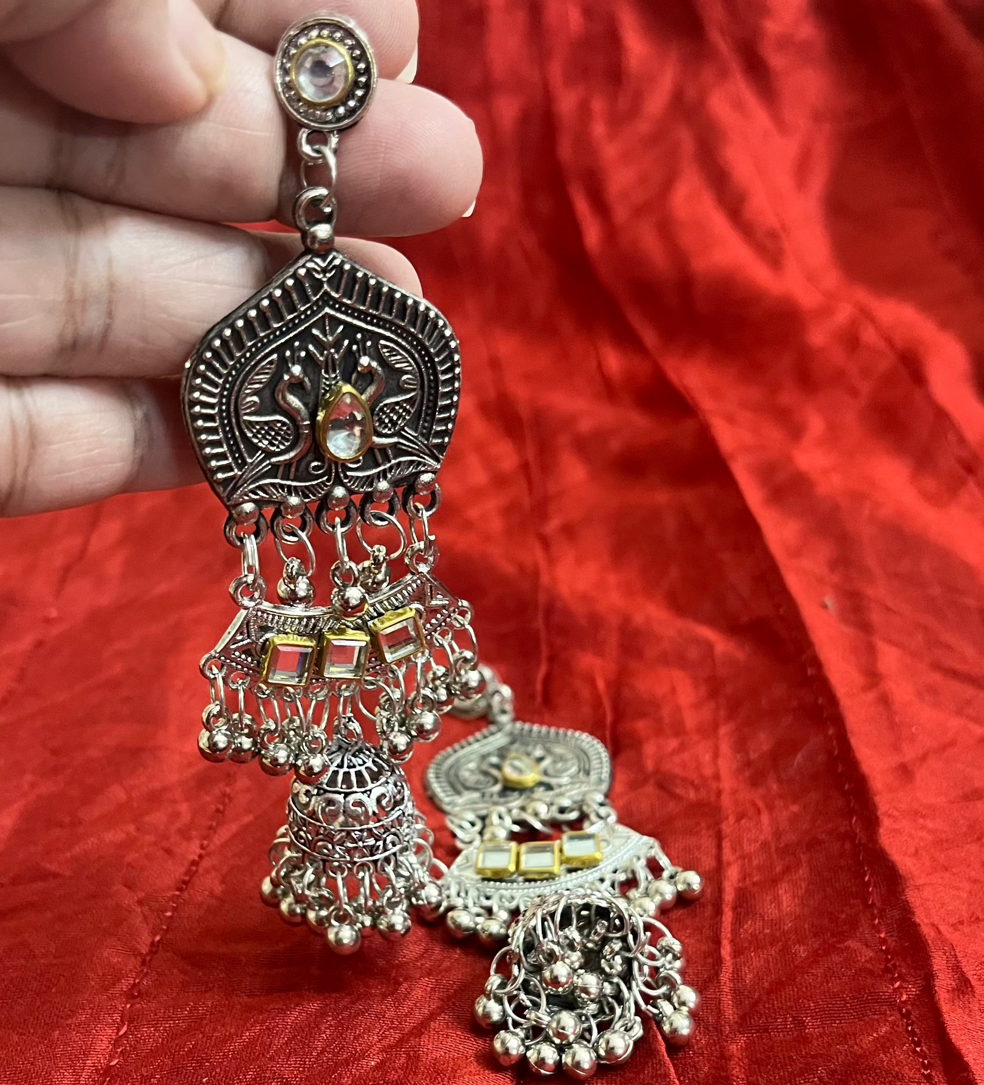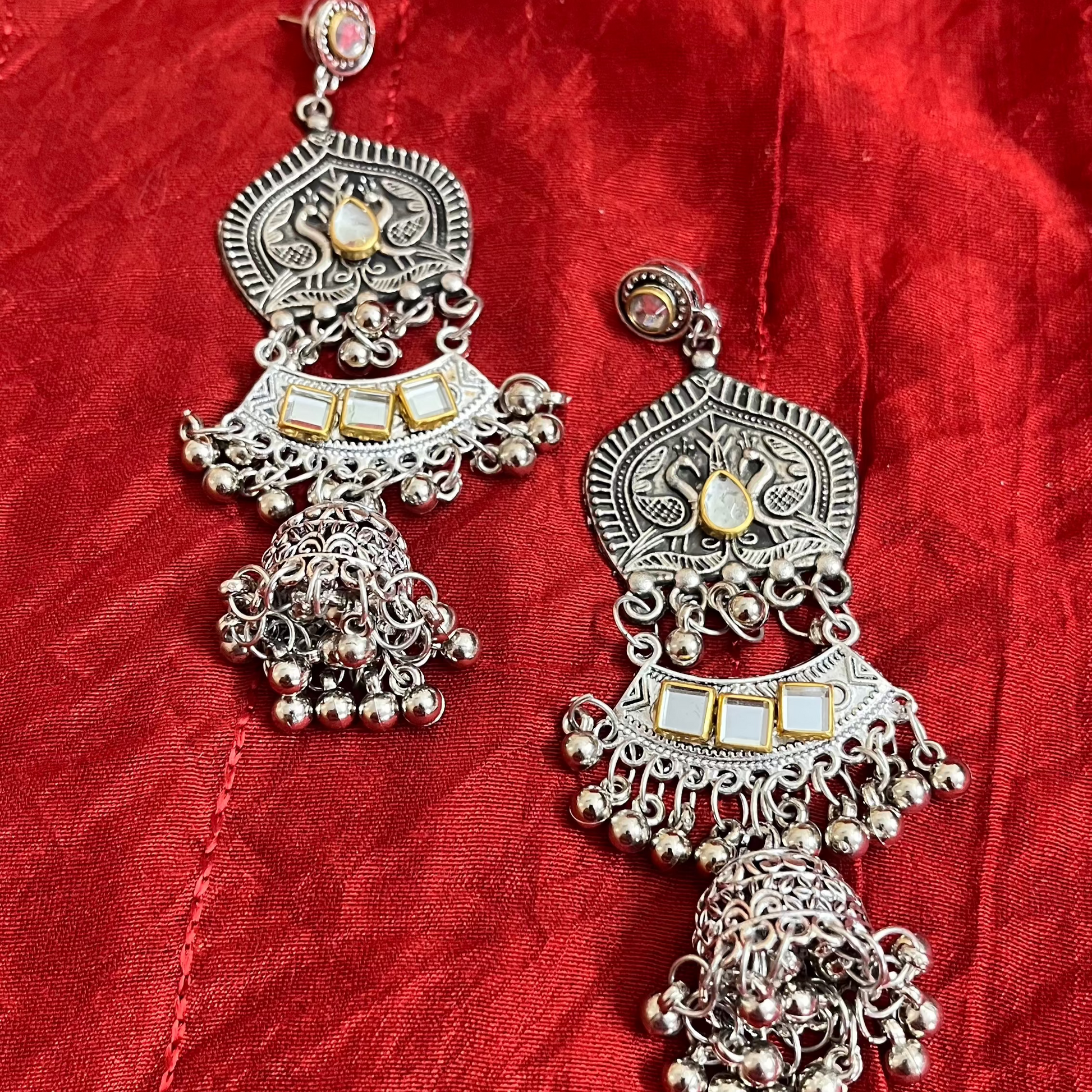 Drape yourself in the ethereal beauty of our Mirror Chandelier Earrings, a perfect fusion of tradition and modern charm. Designed to dazzle, these earrings feature delicate mirror embellishments that catch the light with every turn, creating an enchanting shimmer. The intricate chandelier silhouette adds a regal touch, making them ideal for festive occasions, weddings, or when you simply want to make a statement.