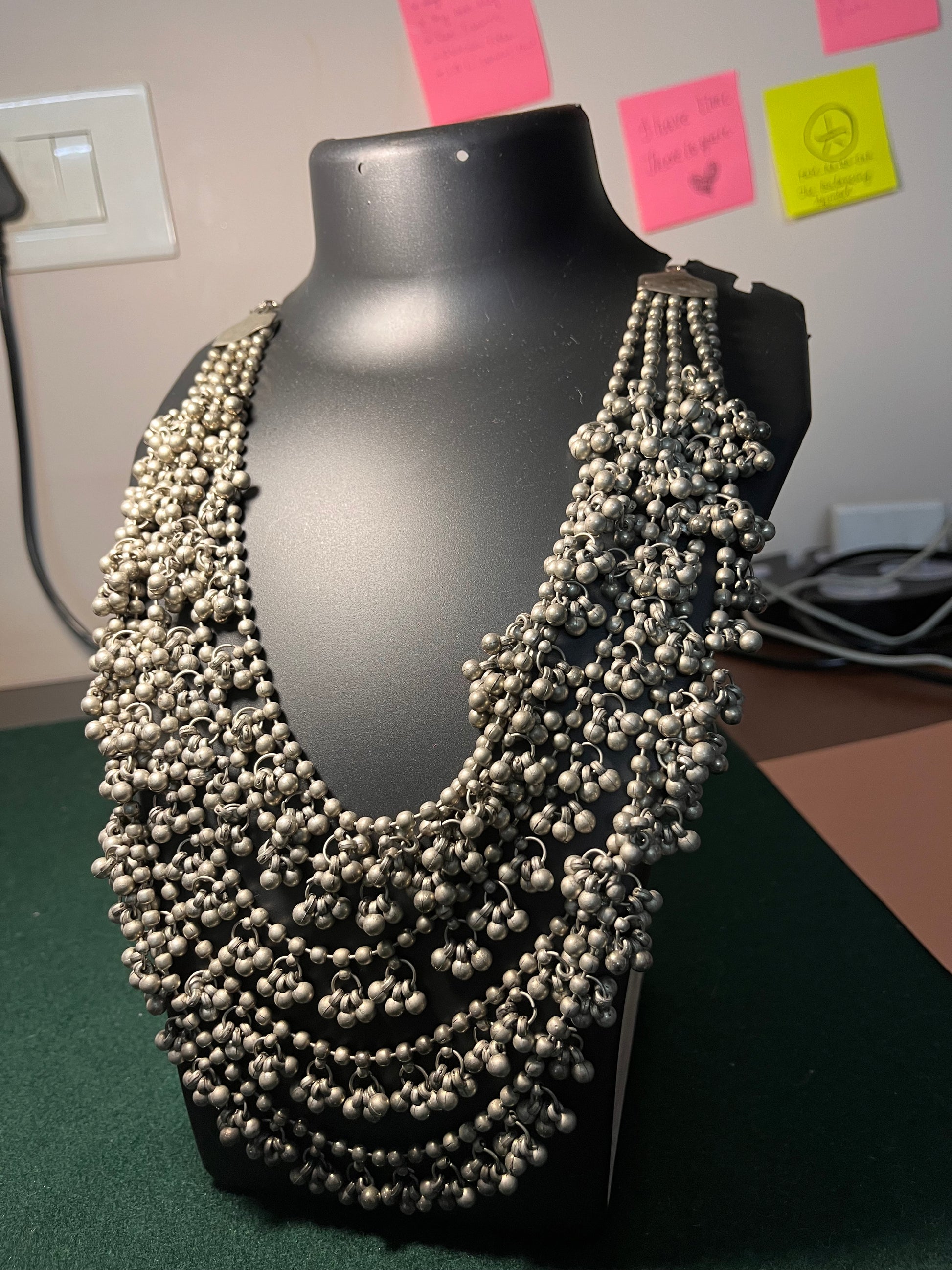 The Ghoongroo Necklace is a captivating piece of jewelry that embodies rhythm, tradition, and elegance. Inspired by the small metallic bells (ghoongroos) worn by classical Indian dancers, this necklace features intricate designs adorned with tiny bell-like embellishments that create a soft, melodious jingle with movement.