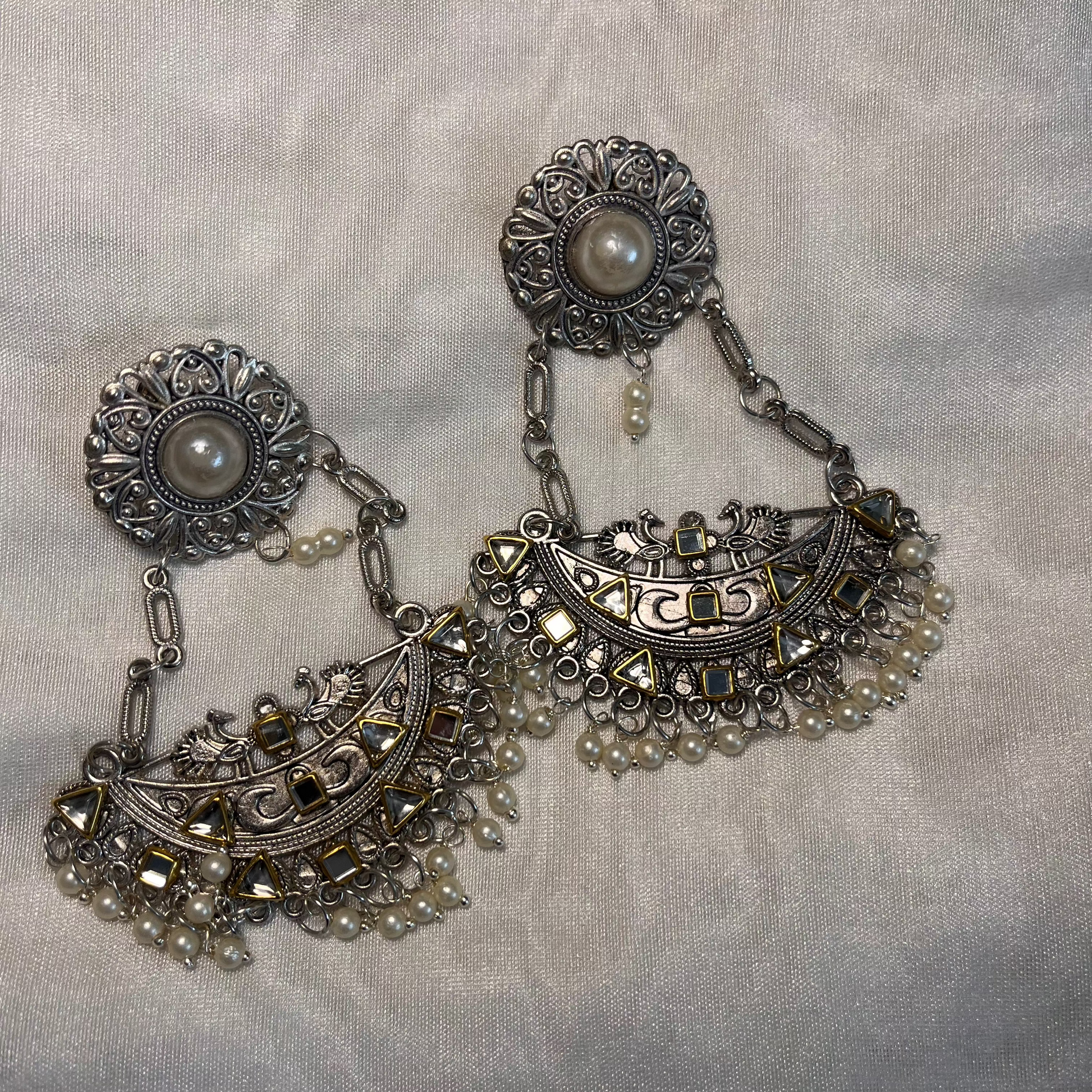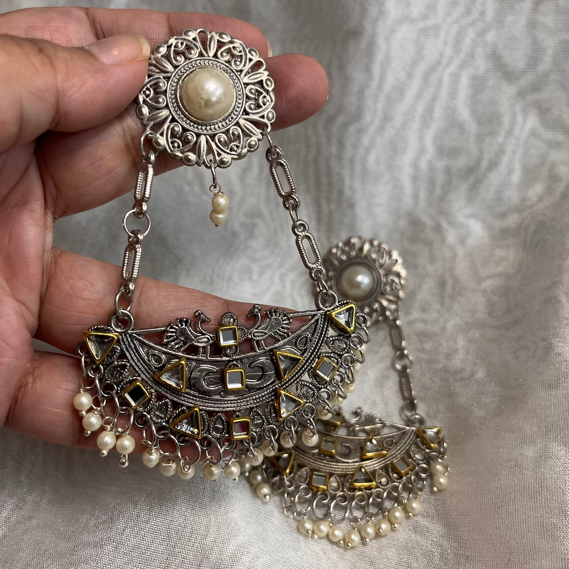 Delicate yet mesmerizing, our Small Hanging Half-Moon Danglers beautifully capture the harmony of celestial and royal elegance. The intricately crafted peacock motif perches gracefully within the half-moon frame, symbolizing beauty, grace, and tradition. The subtle dangling elements add movement and charm, making these earrings a perfect blend of heritage and contemporary design.