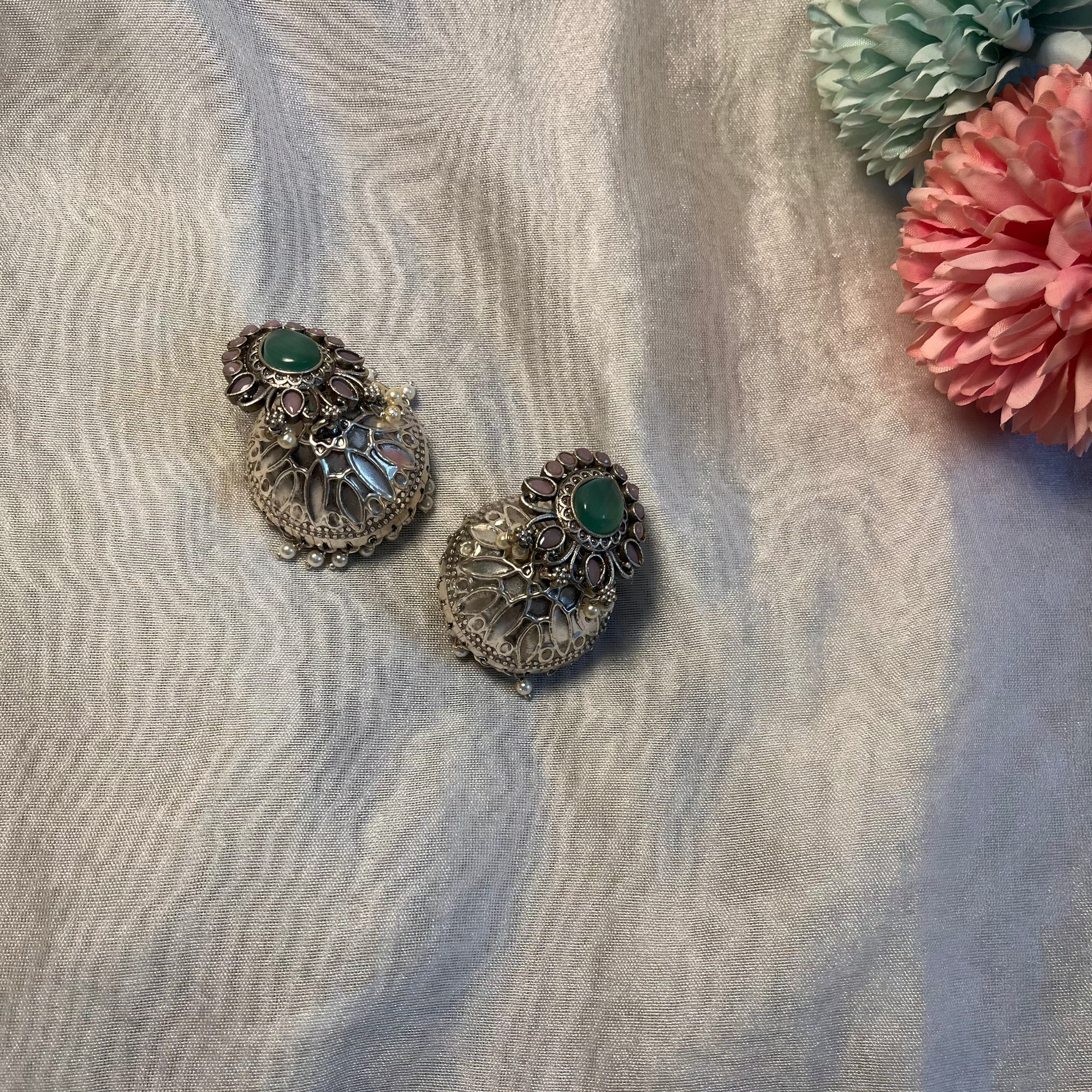 The Jhumka with green Stones is a mesmerizing blend of tradition and elegance, featuring the timeless dome-shaped jhumka design adorned with stunning green stone.
