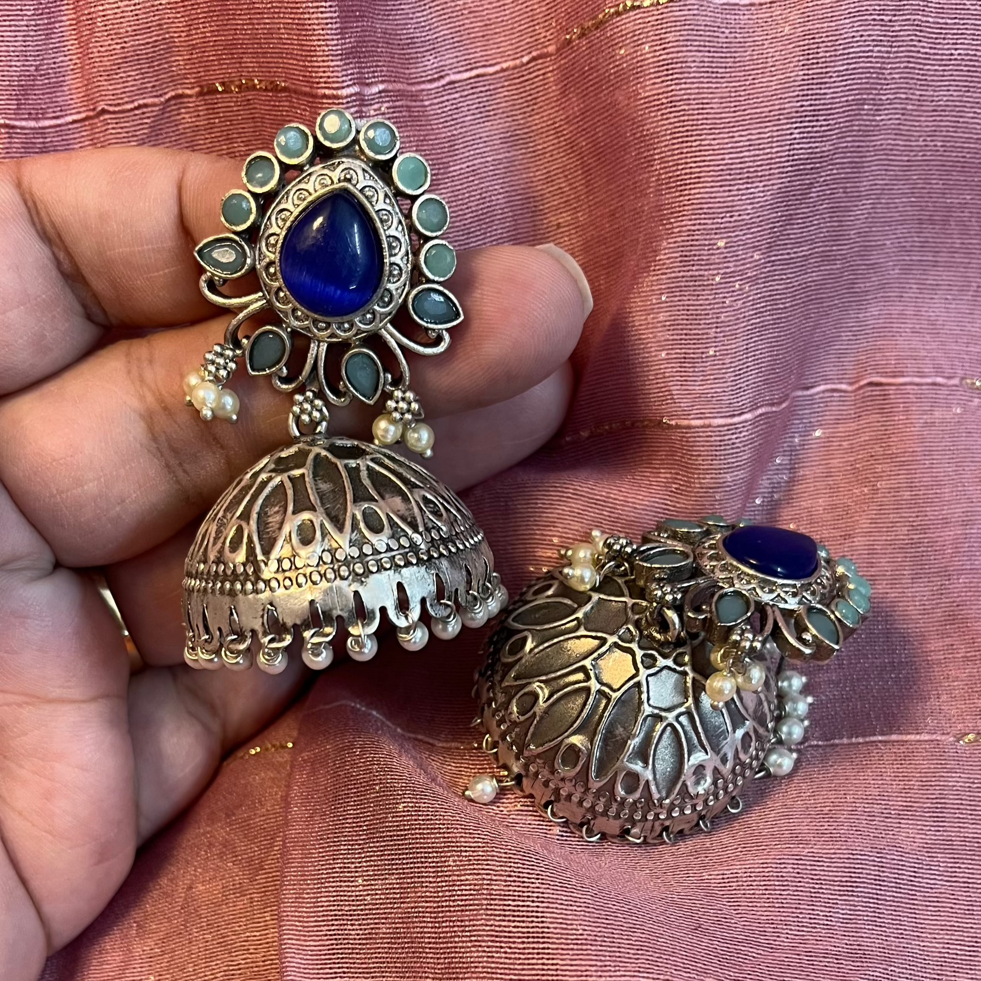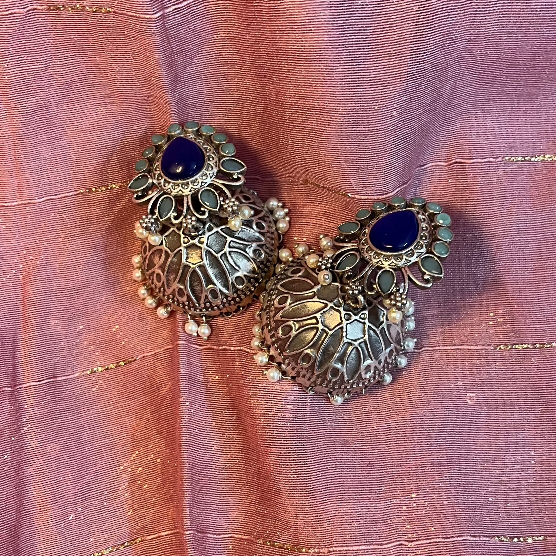 The Jhumka with Blue Stones is a mesmerizing blend of tradition and elegance, featuring the timeless dome-shaped jhumka design adorned with stunning blue stone.