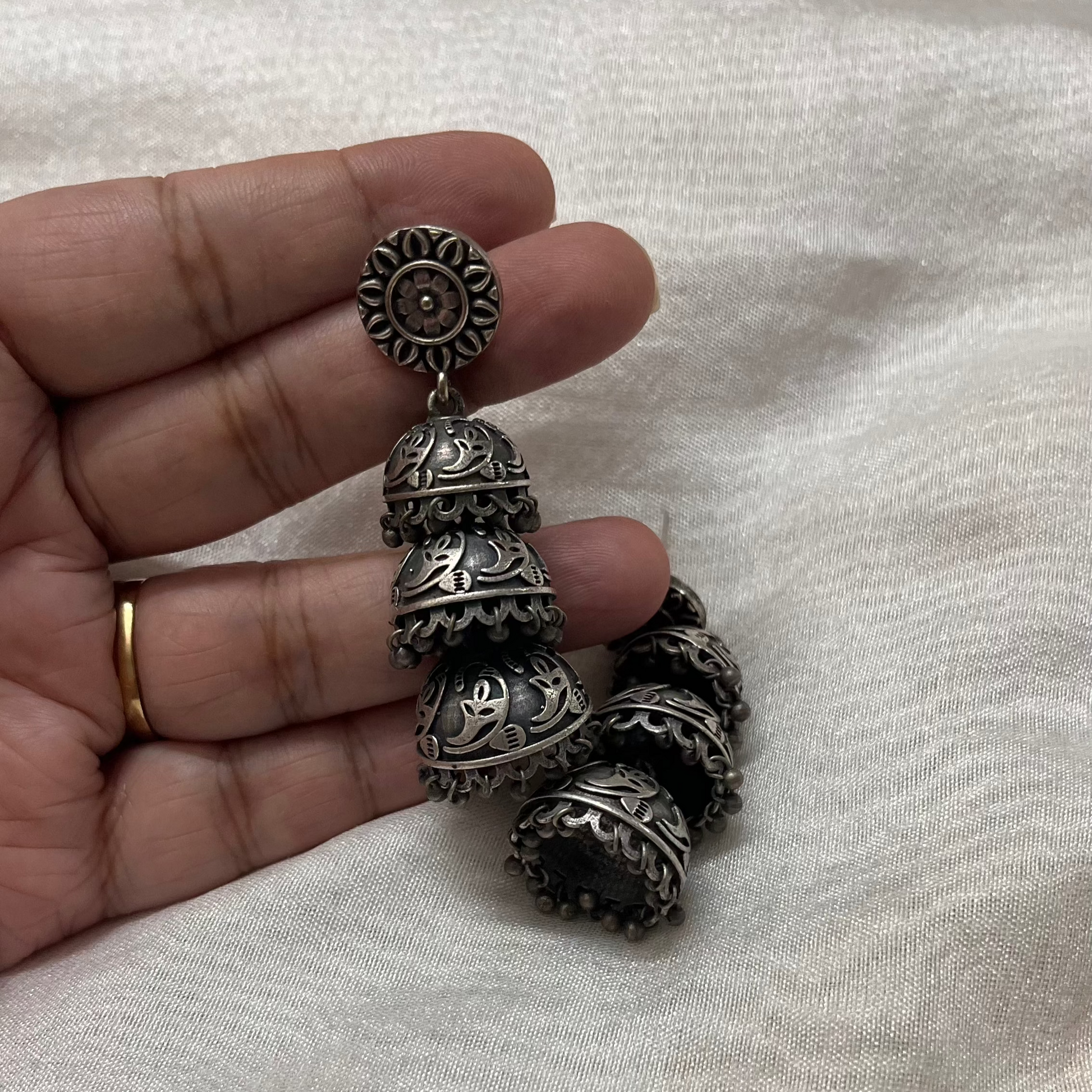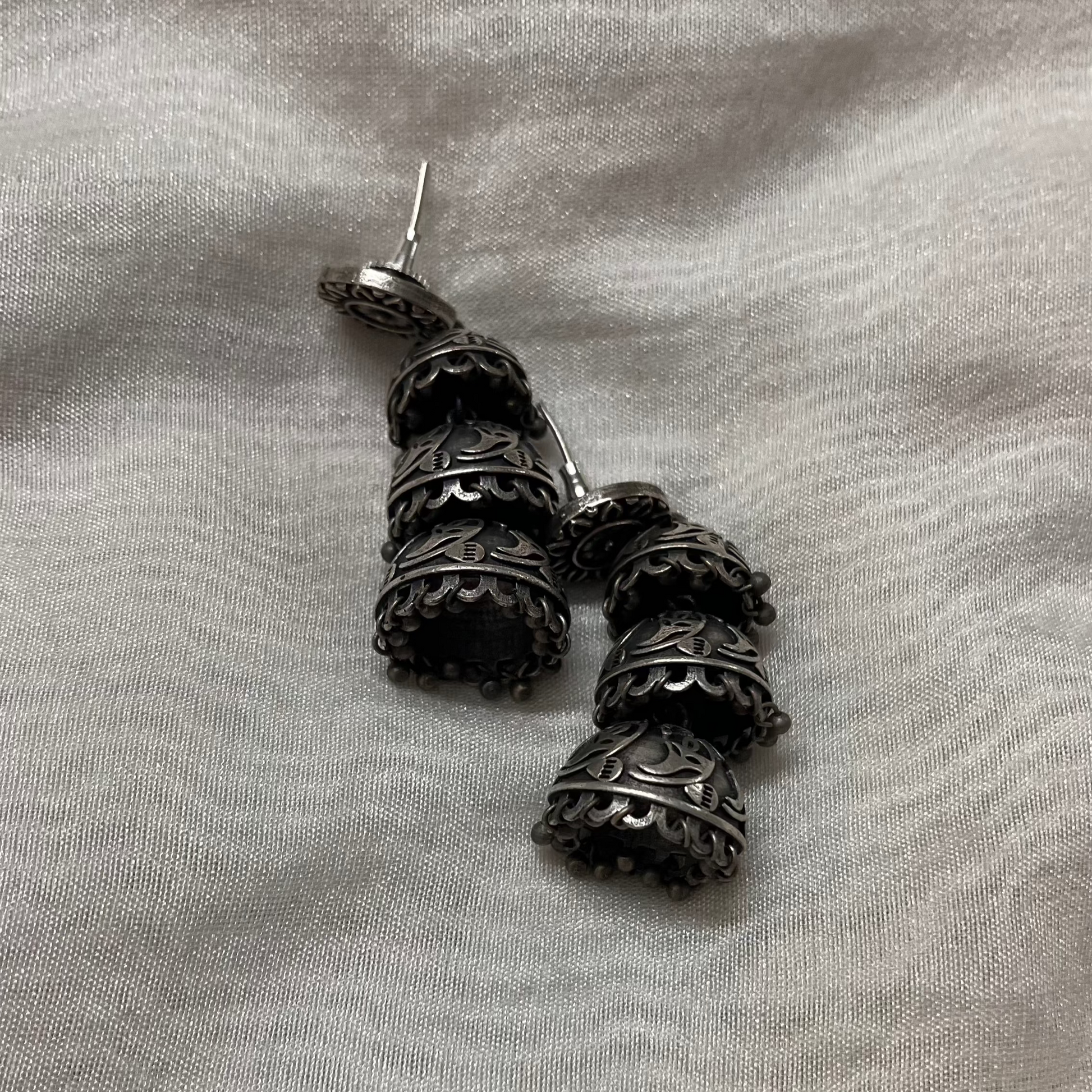 The Sharvani earrings feature a stunning design, with three intricate jhumkas stacked on top of each other. These earrings are a true testament to beauty and elegance, making them a must-have for any fashion-forward individual. Crafted with care and attention to detail, these earrings are sure to make a statement and elevate any outfit.