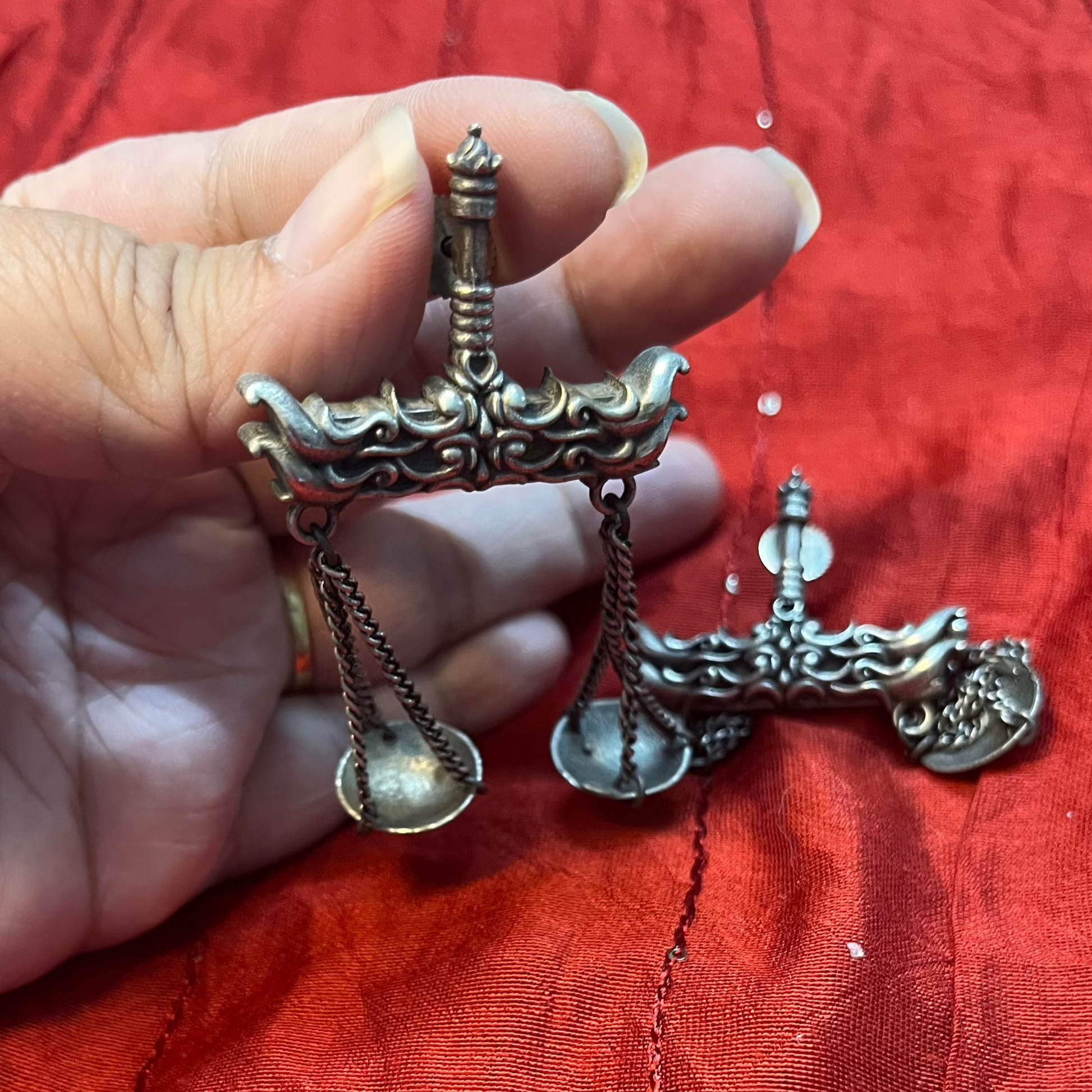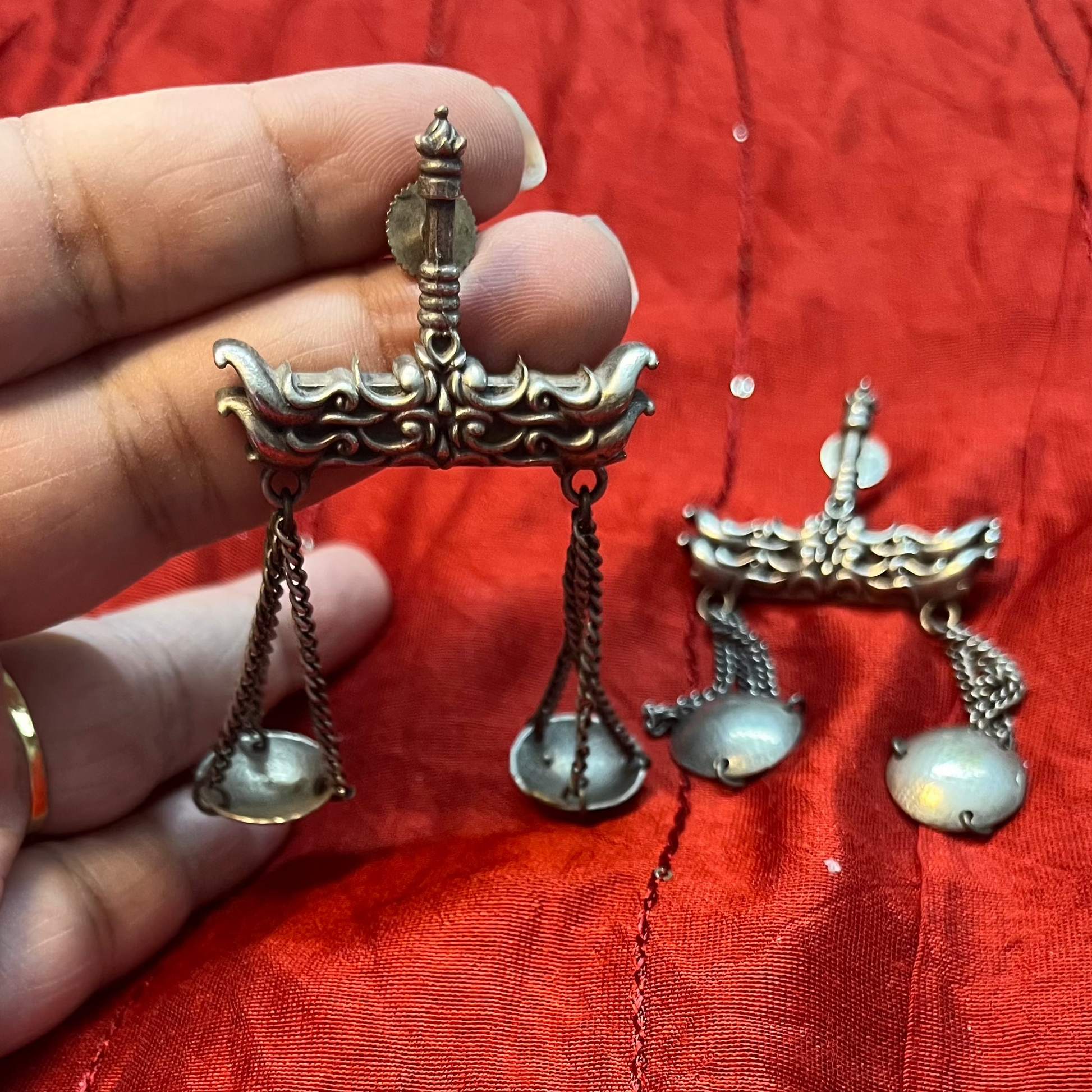 The Taraju Earrings are a unique and symbolic jewelry piece inspired by the traditional weighing scale (taraju), representing balance, justice, and harmony. With a distinctive dangling dual-sided design, these earrings make a bold statement while adding an artistic touch to any outfit.